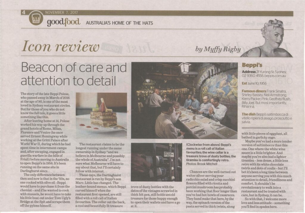 Earlier this year Broadsheet published an article on Beppi’s which encapsulates our values and traditions . See the article below by SAMMY PRESTON Born and bred in Woolloomooloo, my grandpa has a lot of stories about east Sydney – including the time he ate at Beppi’s. It was about 1964 and he was midway through […]